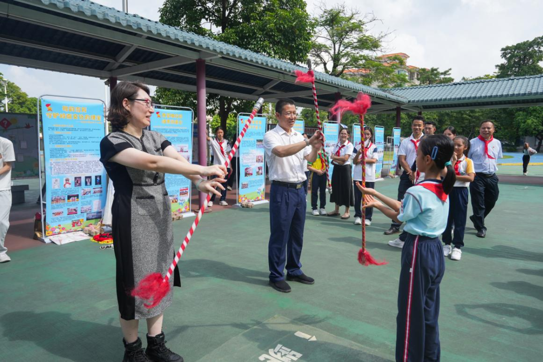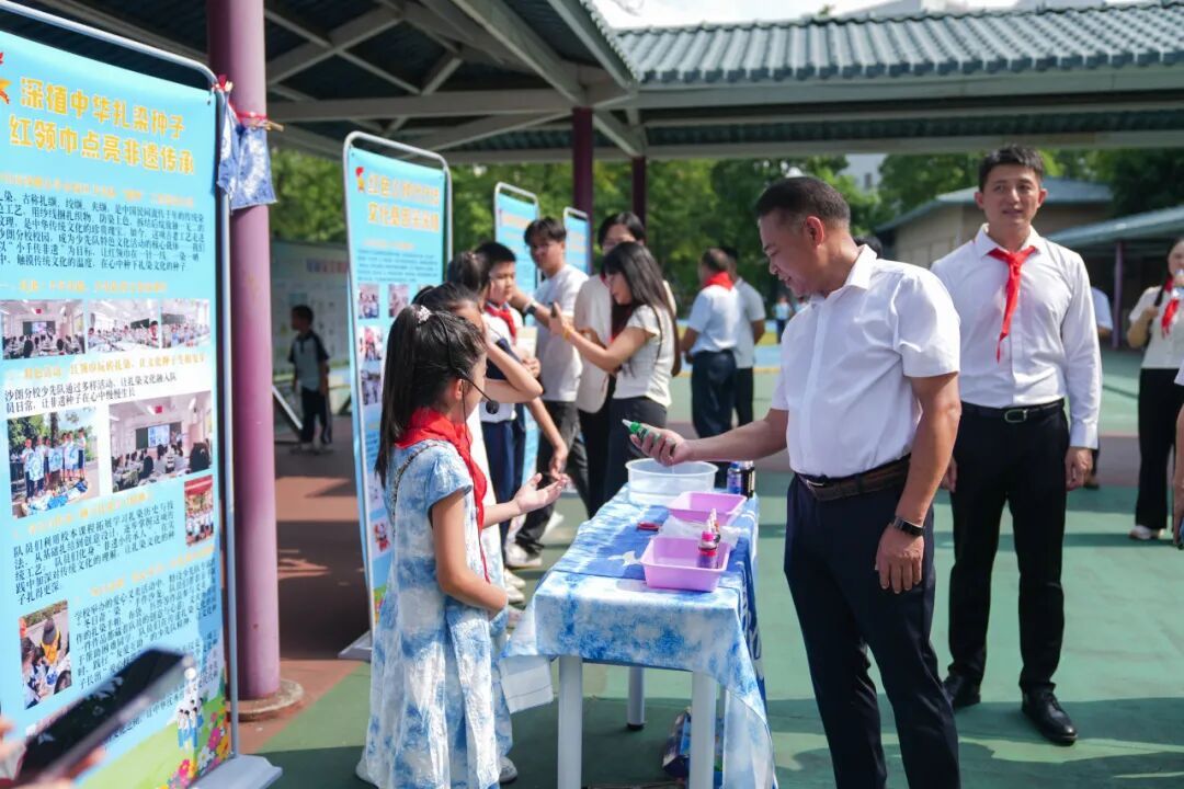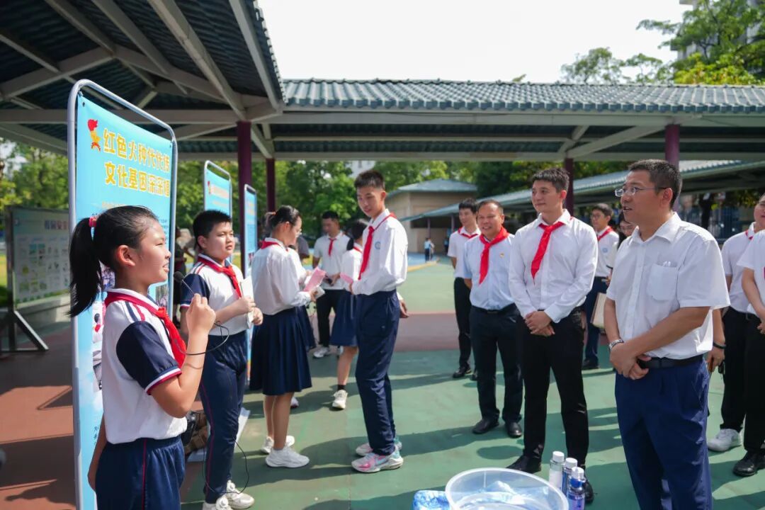 嘉宾领导在红领巾讲解员摊位前了解西区各学校的情况,并与红领巾讲解员代表互动